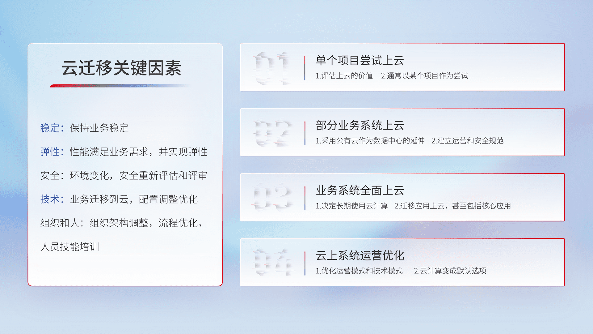 结合实际业务,,从规划设计、、、云平台选型、、、、云原生改造、、、、数据迁移、、集成交付,,,迁移全过程为客户识别最佳上云路径,,做好风险识别管理,,,,设计网络架构、、、身份权限、、、、安全审计合规、、、操作审计、、、日志审计、、监控告警策略、、、多站点容灾设计等,,对云上基础设施进行整体规划,,,提升IT治理水平,,以满足弹性、、、、高可用、、、、高性能的需求。。。。