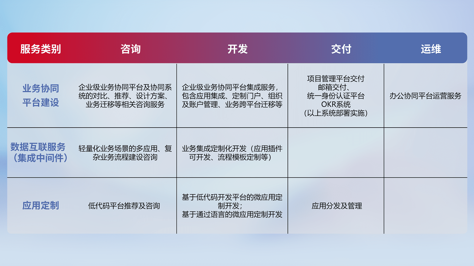 针对钉钉、、、企微、、、、IDaas等平台级产品提供产品的规划、、、、方案、、、、交付、、定制化开发等服务,,实现如统一协同办公、、、智能客户服务、、、混合会议管理、、、、智能数据查询、、、等业务场景,,,实现数字化转型。。